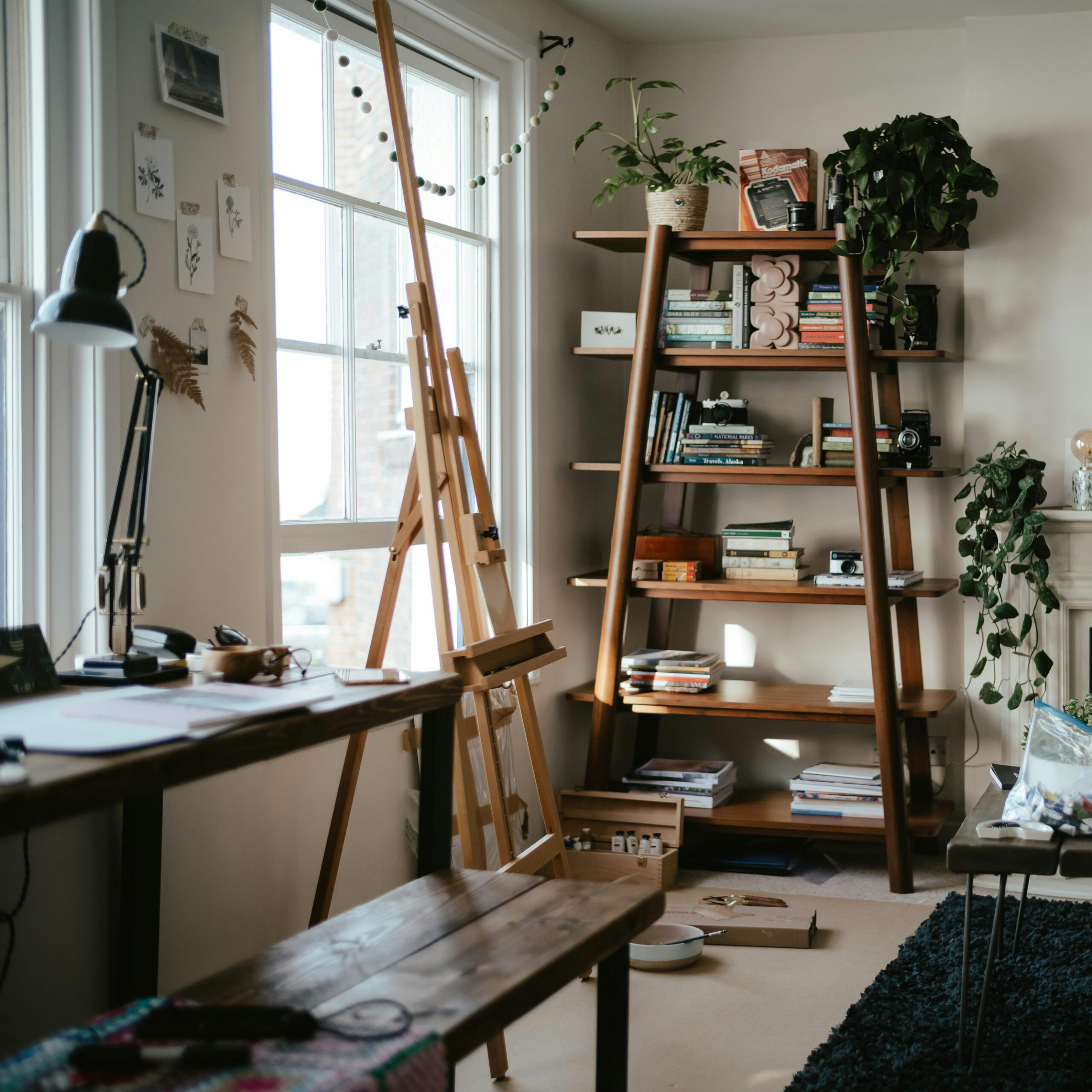 A bright, airy living‑room studio that seamlessly combines practical storage with curated artistic flair. Natural light, streamlined shelving, and versatile work surfaces create an effortlessly inspiring environment. Thoughtfully layered textures and discreet organization ensure a balance of calm and creative energy.
